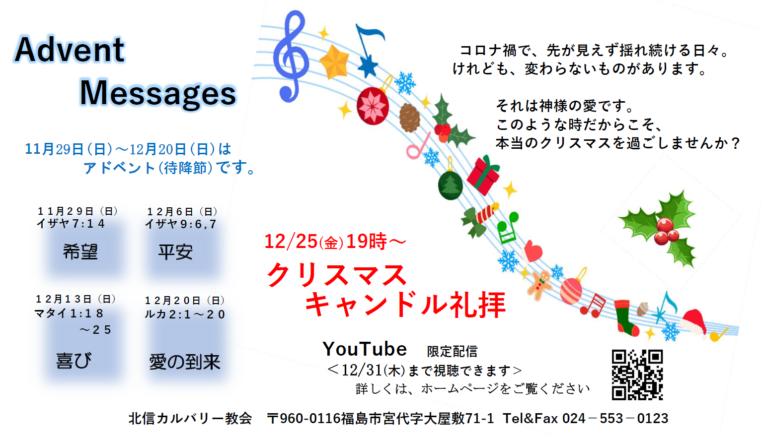 今年は新型コロナ感染予防のためユーチューブ配信します。 案内チラシはこちら2020クリスマスチラシ.pdf You Tube配信アドレスはこちらをクリックしてください。 イベント 2020/12/10 Hokushin-Calvary